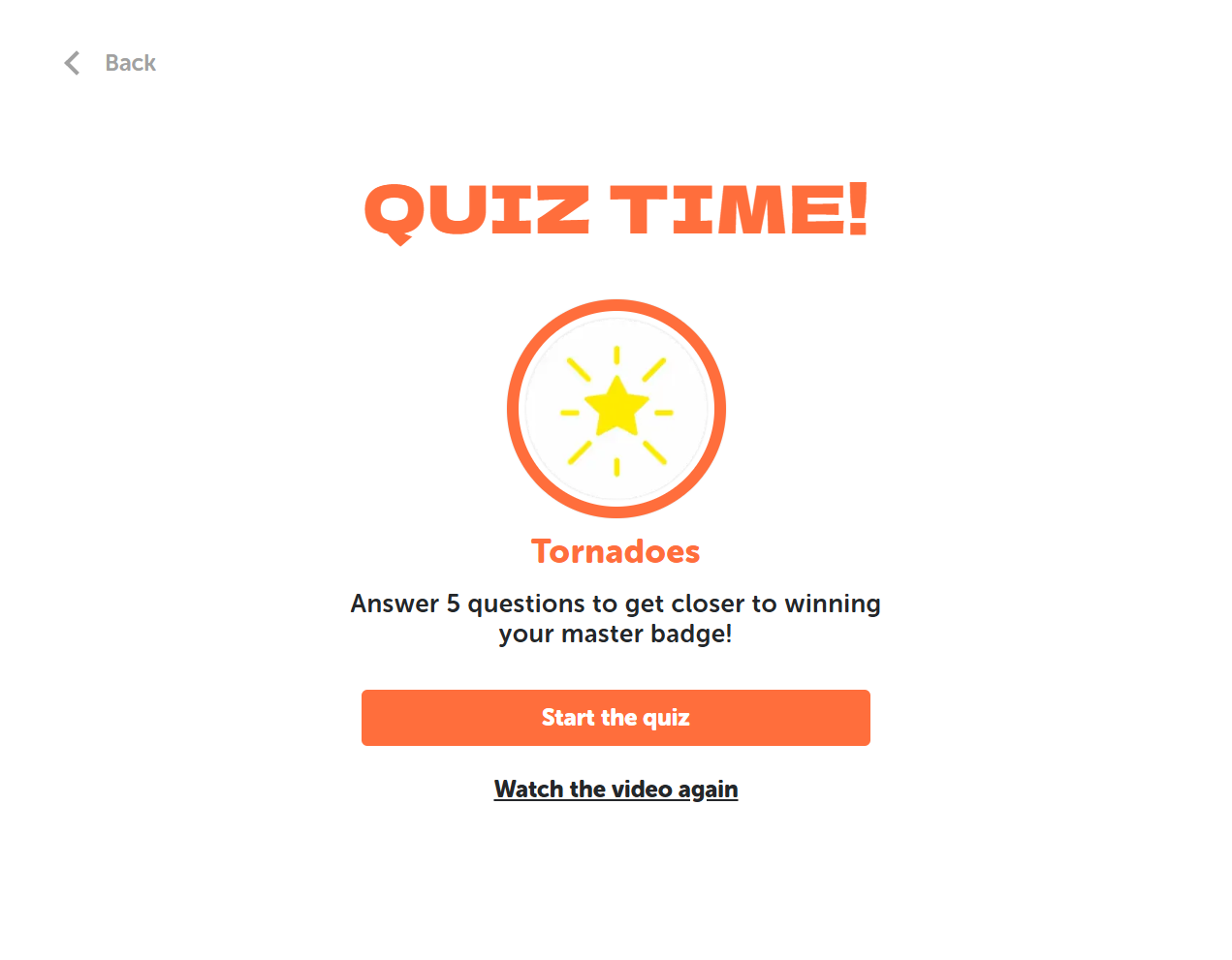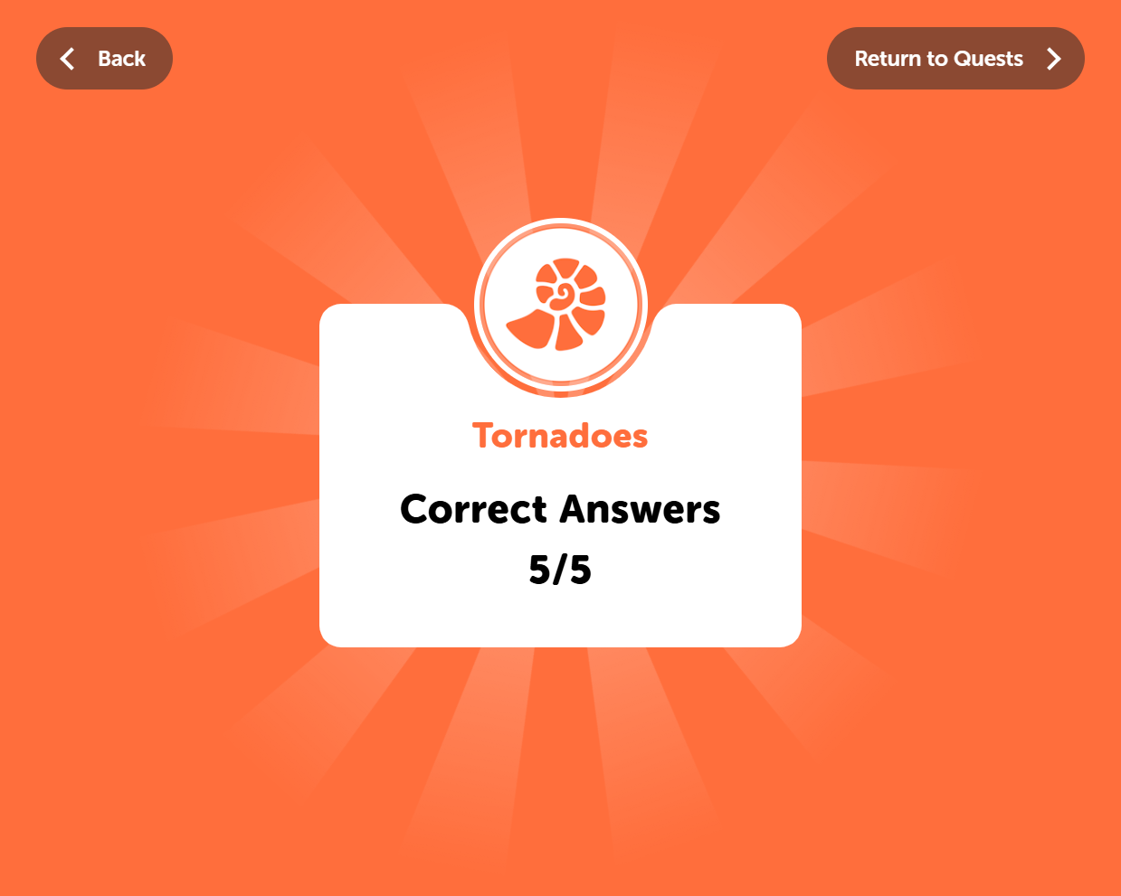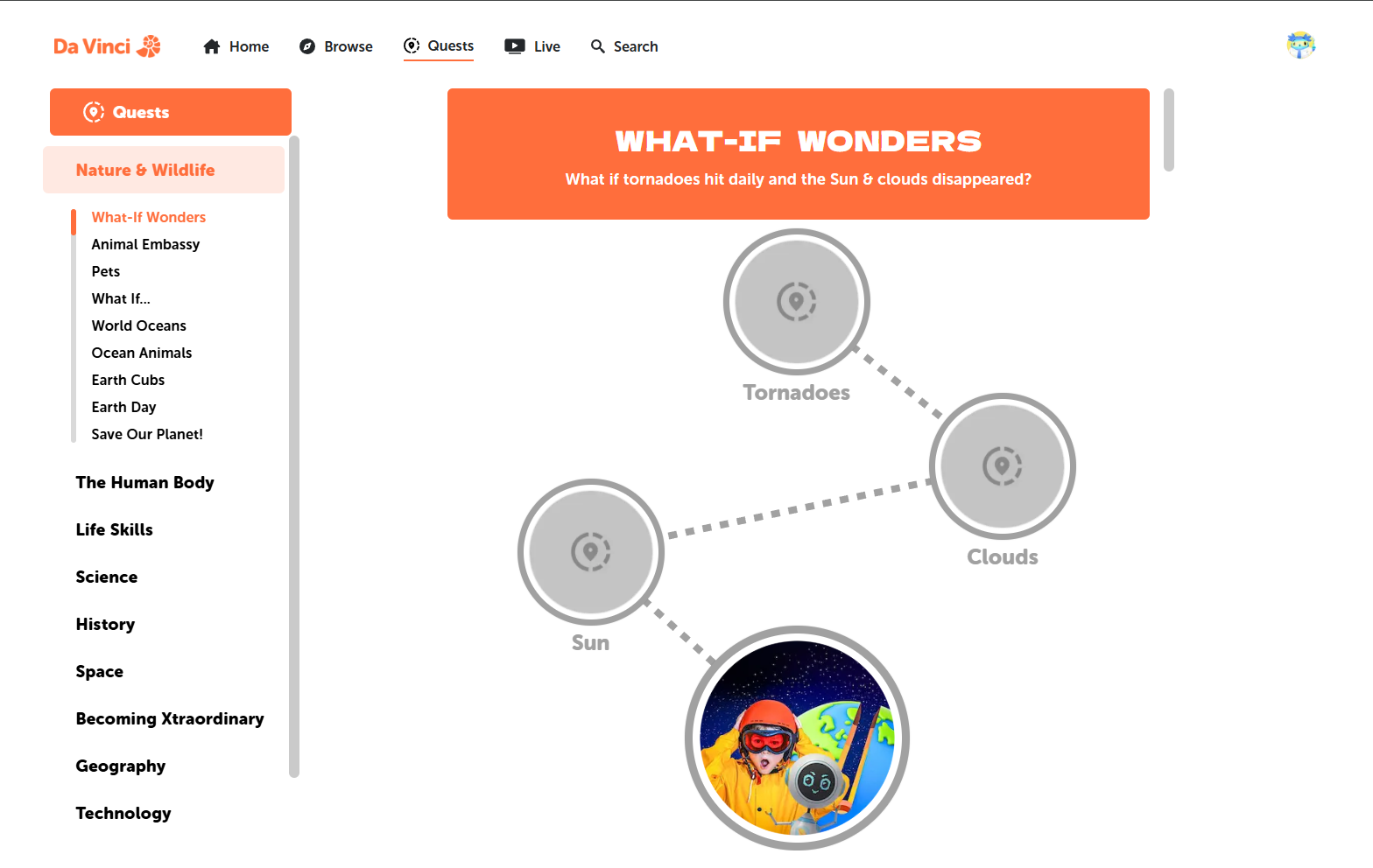 The Da Vinci Media quiz tool was created as part of a new educational “Quests” feature created for the Da Vinci mobile app around the start of 2023, and then later added to the Da Vinci website. Users would be able to select a quest through a map of educational challenges, watch a short educational snippet based on the selected challenge, and then answer a quiz to be rewarded with a completion badge.